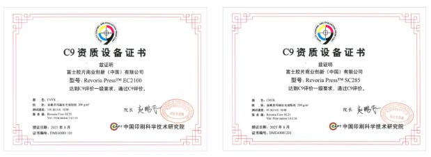 “C9数字印刷(彩色)评价”体系发布后,富士胶片商业创新(中国)率先参加测评,其三款彩色生产型数字印刷系统 Revoria Press™ PC1120、Versant™ 3100i Press及Versant™ 180i Press同时获得首批“C9资质设备证书”。